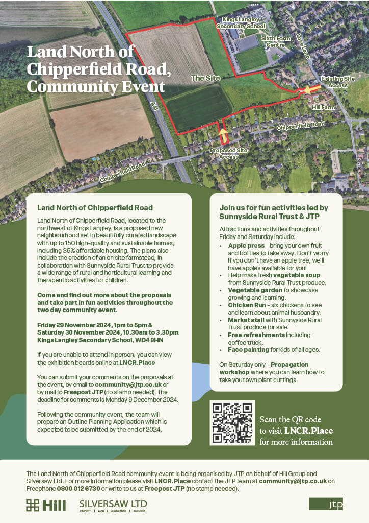 Please find our more about the event below, at which you can also find our more about the proposed housing development: Land North of Chipperfield Road.