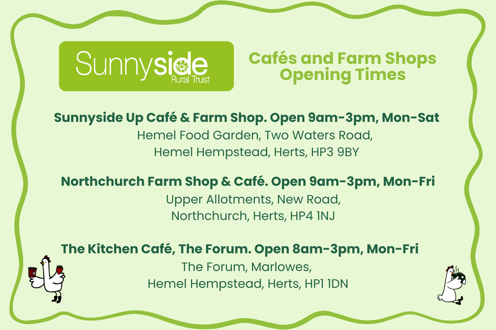We operate two cafés and farm shops: one at Hemel Food Garden and another in Northchurch. Additionally, we have a café in partnership with DENS at The Forum.