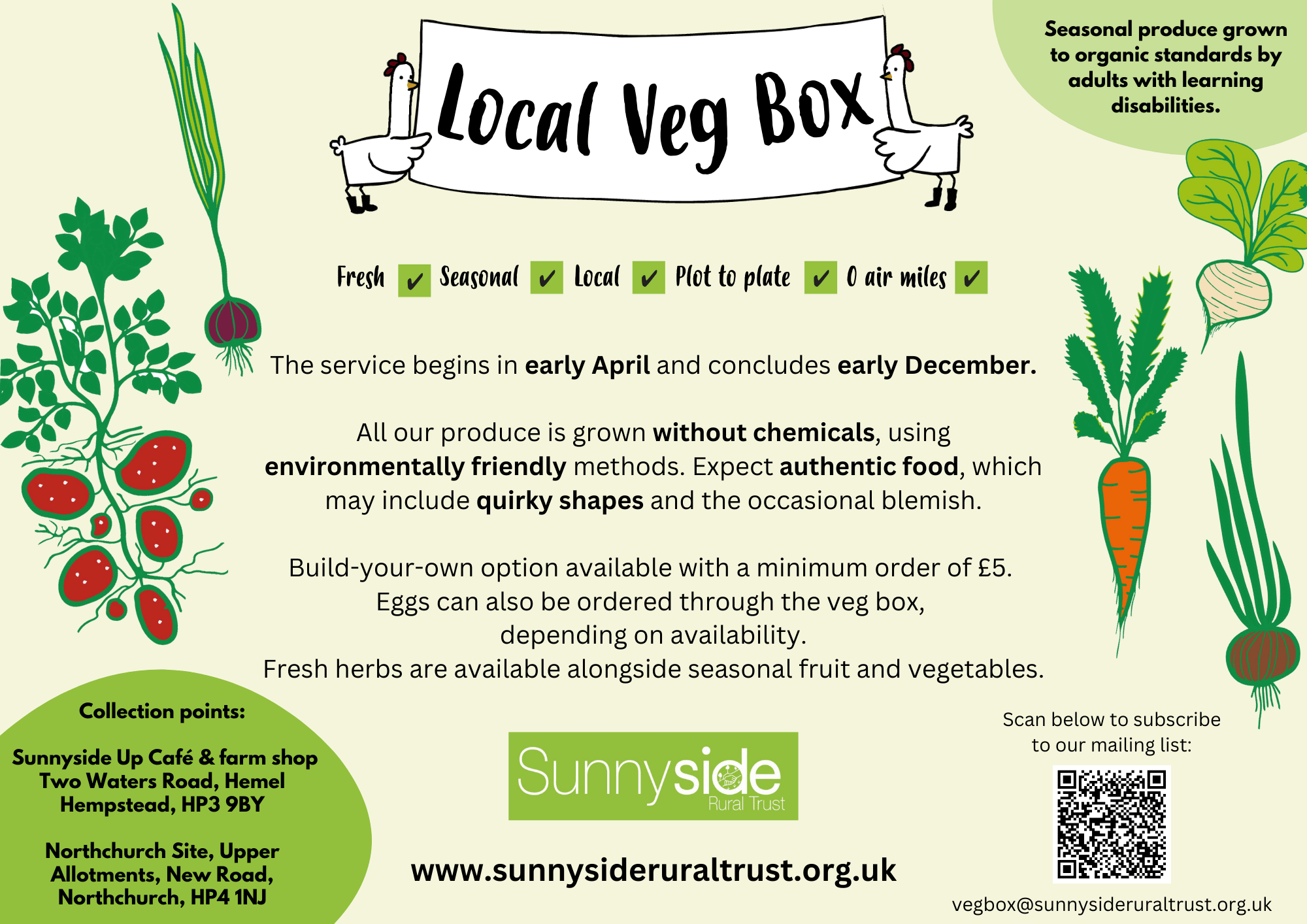 Veg box collection is from our Northchurch site Farm Shop from Wednesday afternoon, or from our Hemel Food Garden site on Thursday, Friday or Saturday. We also offer collection from our weekly Berkhamsted High Street market stall (Thursdays 10:30–12:30).