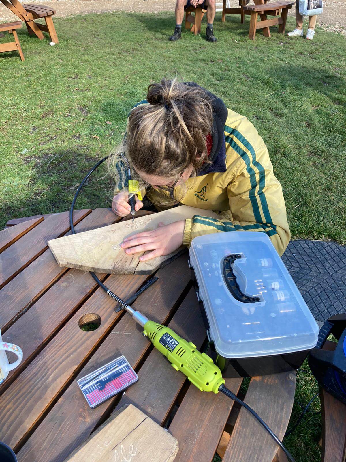 Zoe is trying out the dremel from the Activity Centre to make signs for the stables.