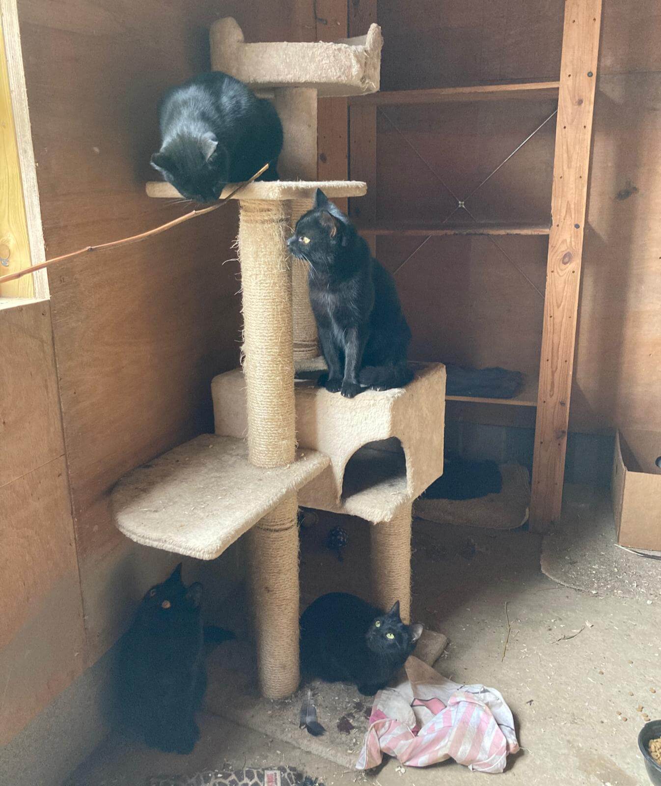 The feral cats are using the various climbing materials in their stable space.