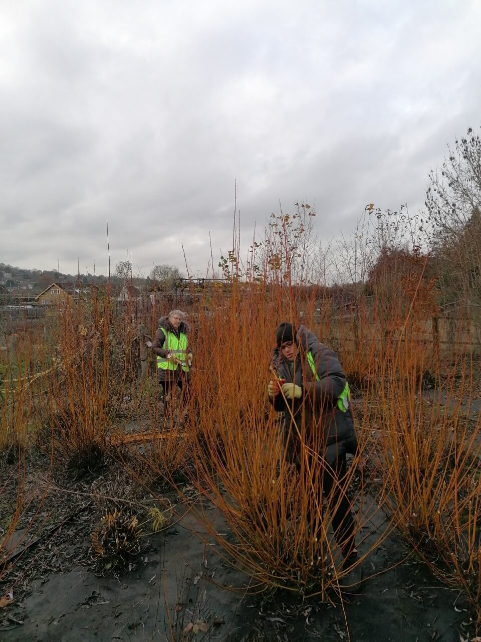 Noreen and Annette Timms helping to gather willow from our coppice area. Once harvested and bundled, this will also be sold.