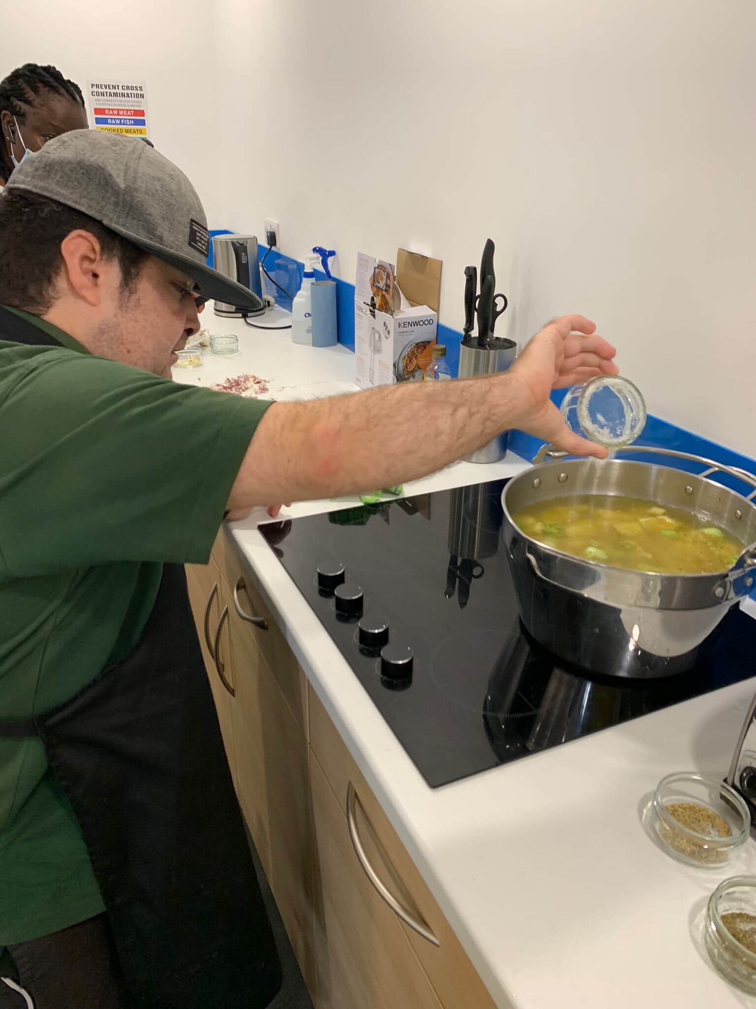 Soup making from Hemel Food Gardens freshly harvested potatoes and leeks. Jim adding herbs, Cathy chopping potatoes and Hannah blending the soup – a real team effort.