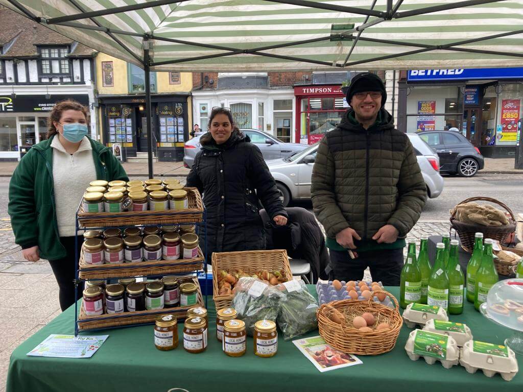 Noreen, Lewis & Charlotte on the market stall this week – with Lewis having prepared the lovely stall board.