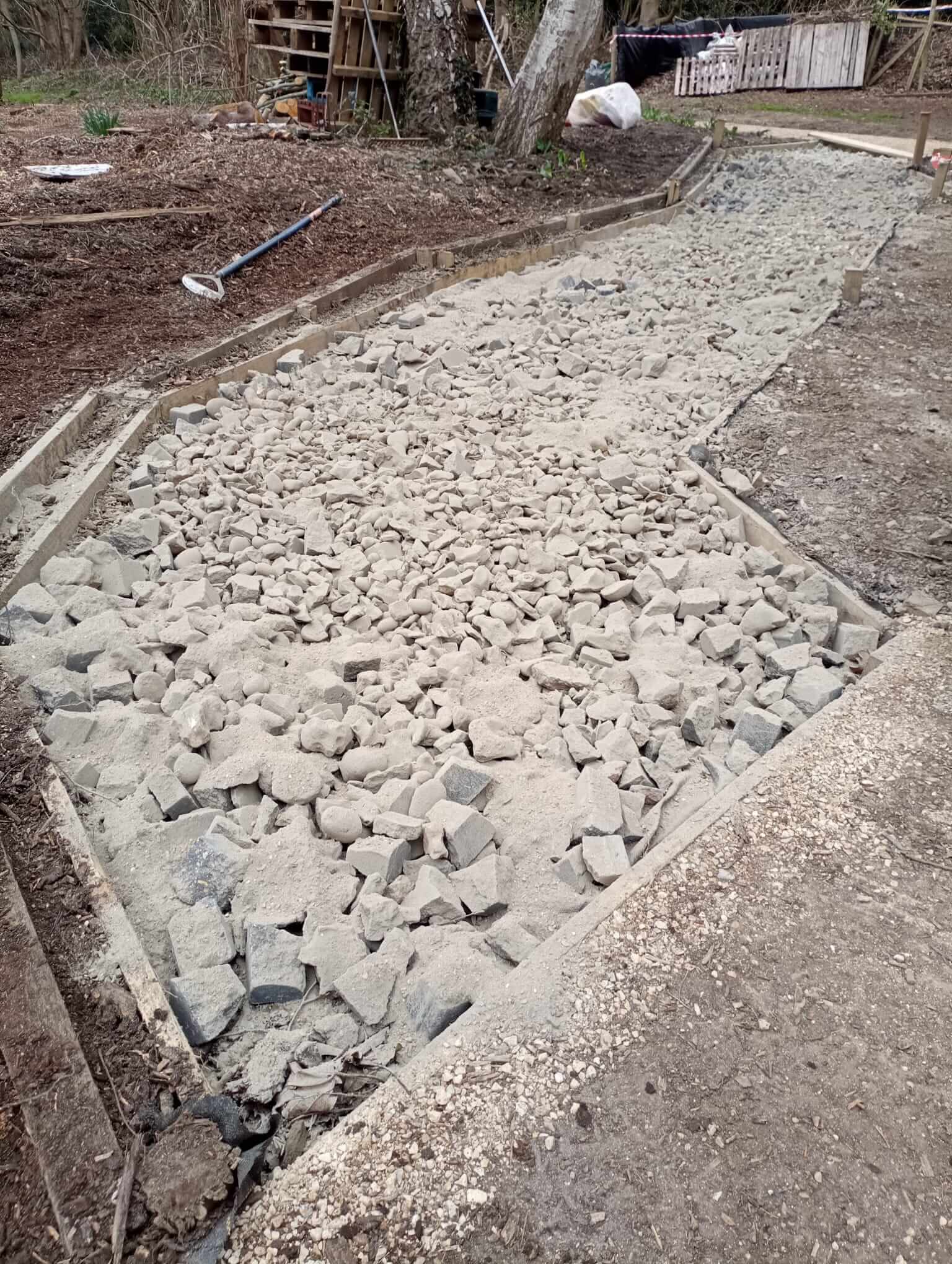 Unwanted brick from a site clearance was broken up and repurposed for the pathway. This had postcrete added and was topped up with self binding gravel. Very neat.