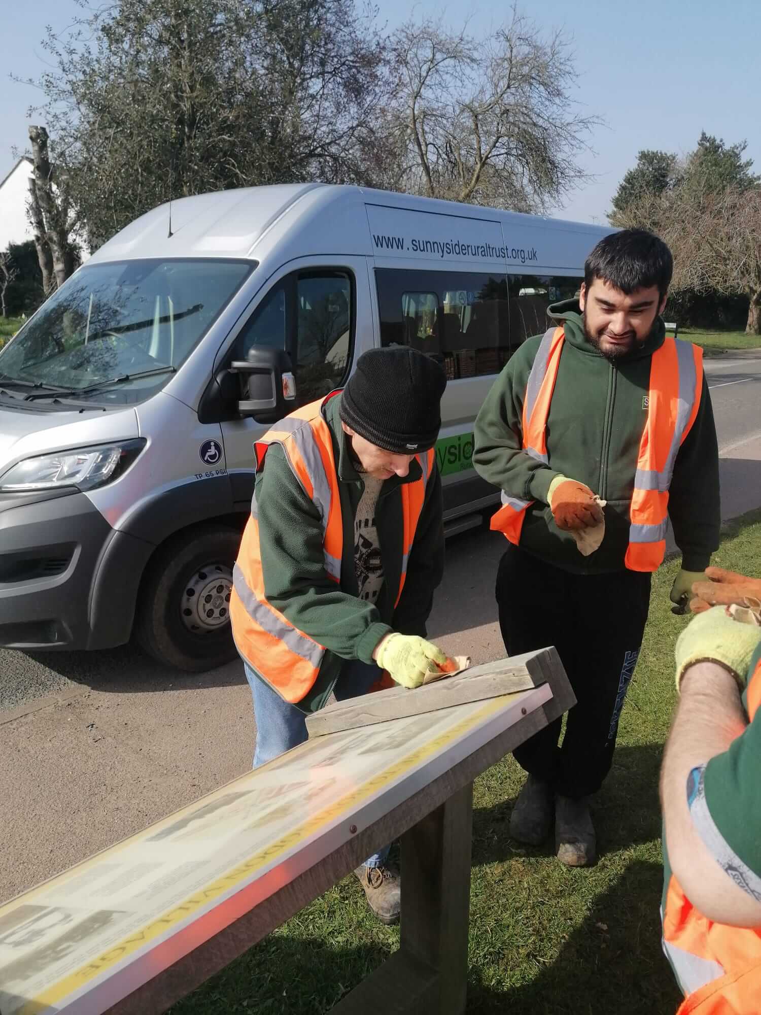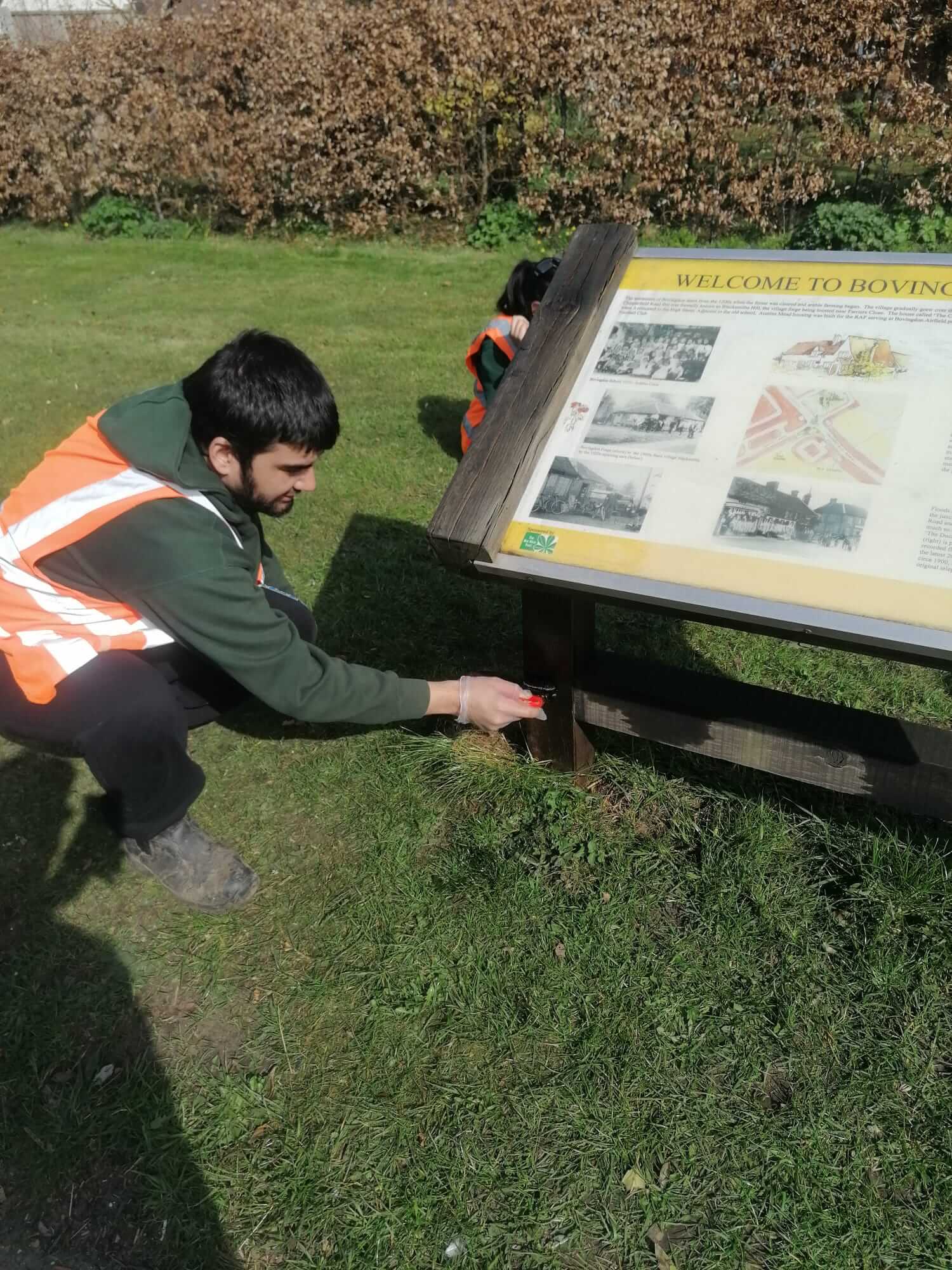 Continued maintenance of the Bovingdon signs around the village sanding and varnishing them. Luka, Becca, Noreen, Riz and Michael.