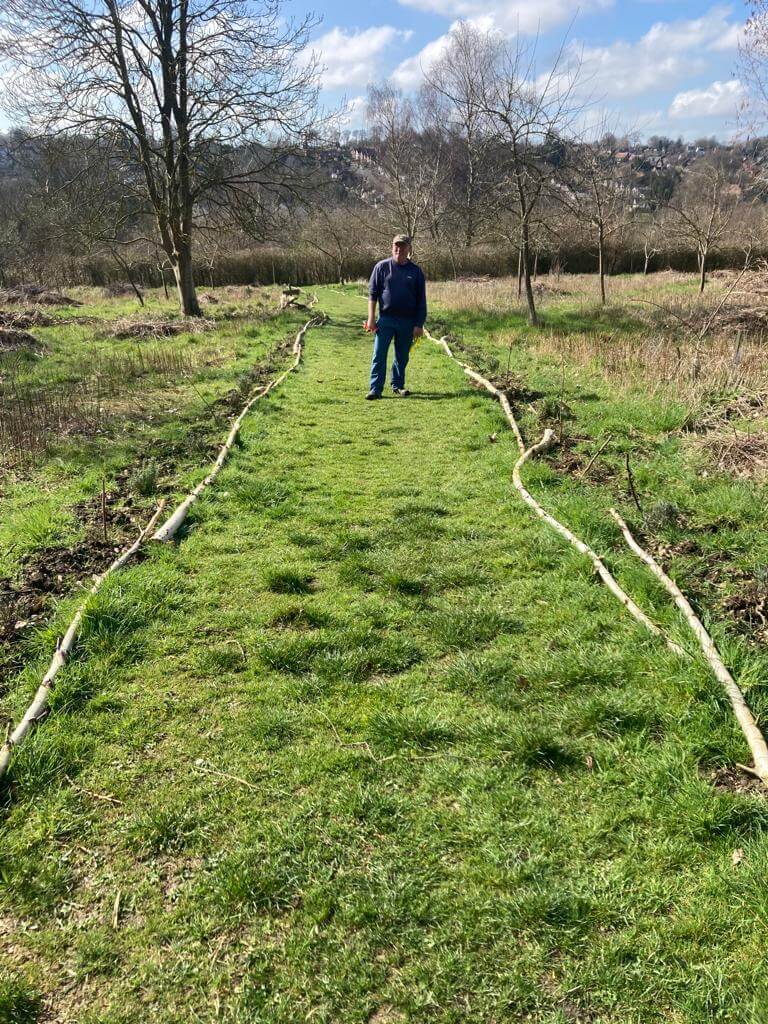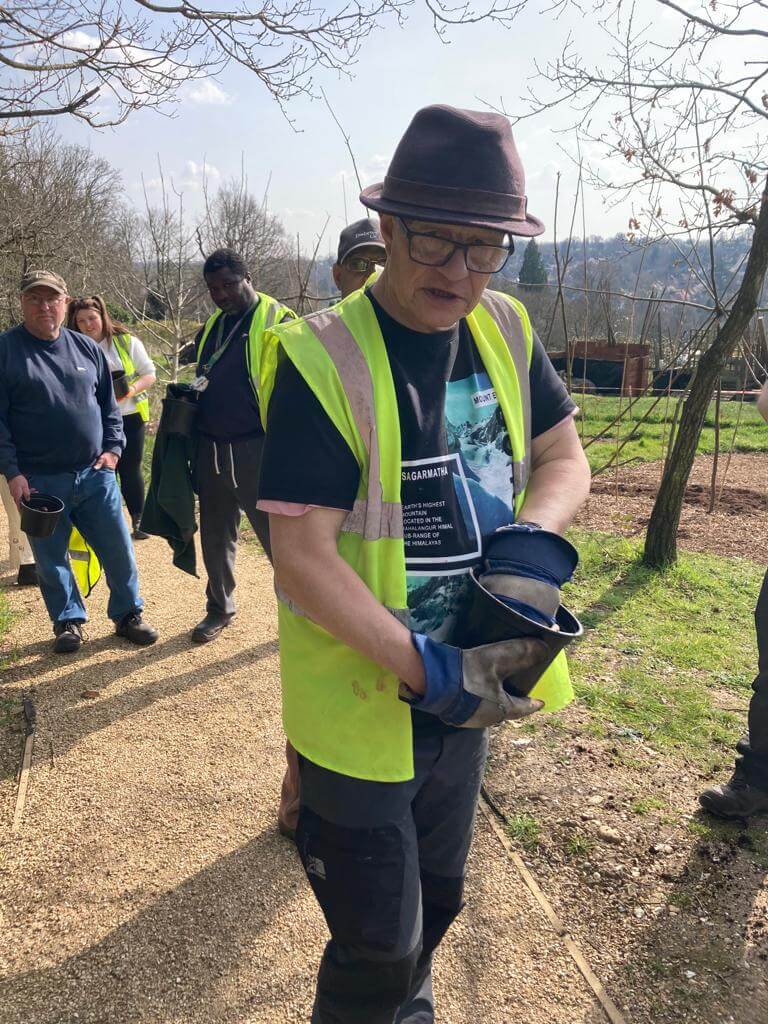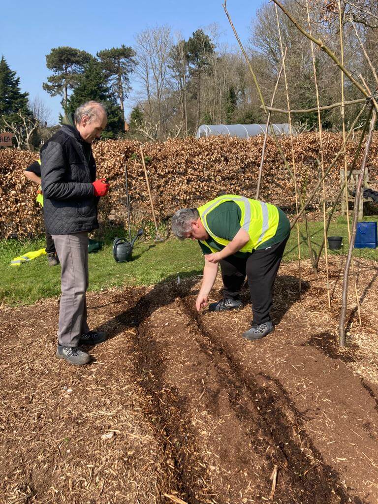 Becca, Michael H, Neil were direct sowing flower seeds and Michael H then walked the ‘tight rope’ to firm them in.
